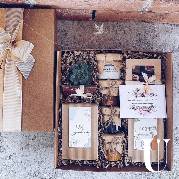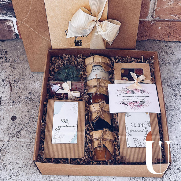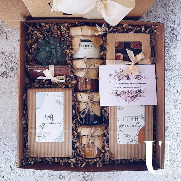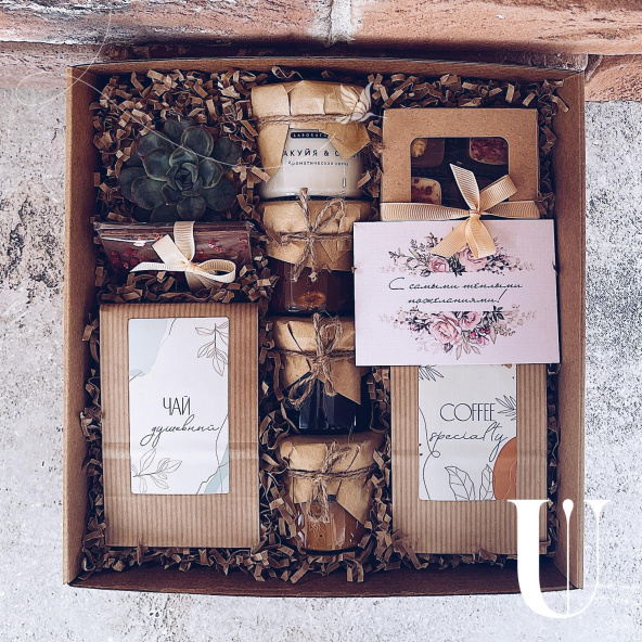 Баночка вкуснейшей карамели приятное дополнение к чашке чая или кофе. Баночка клюквенного джема - домашний уют в каждой ложке. Баночка натуральной арахисовой пасты - источник полезных жиров и энергии. Свеча ароматизирует комнату уютом и спокойствием. Бельгийский молочный шоколад с ягодами тающий во рту деликатес. Атмосферный суккулент - живое напоминание о природе и уюте. Мини-открытка - место для вашего личного сообщения. Изящные детали, дополняющие атмосферу уюта.Стильное и праздничное оформление.