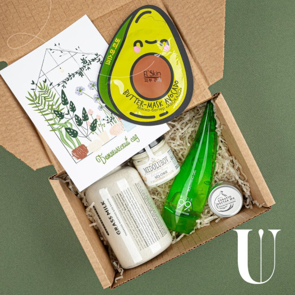 Набор в подарок из антисептика, маски для лица, бальзама для губ, орехов в шоколаде, глиняной маски для лица
