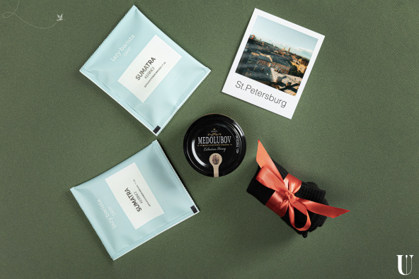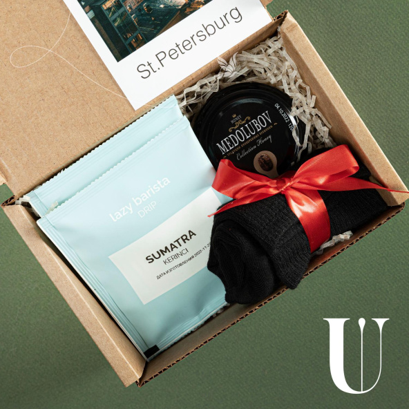 Подарочный набор из дрип-кофе, носочков, орехов в шоколаде и меда-суфле