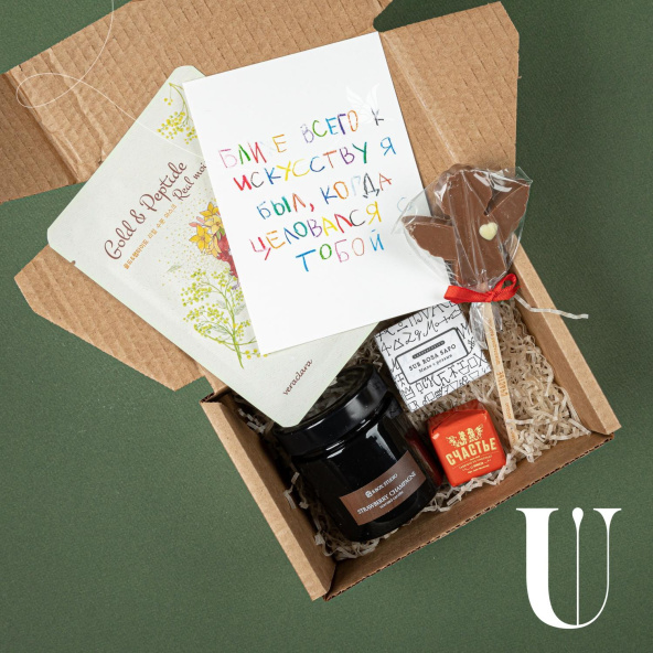 Подарочный набор из шоколада ручной работы, джема, соленой карамели, арахисовой пасты, черного чая и открытки