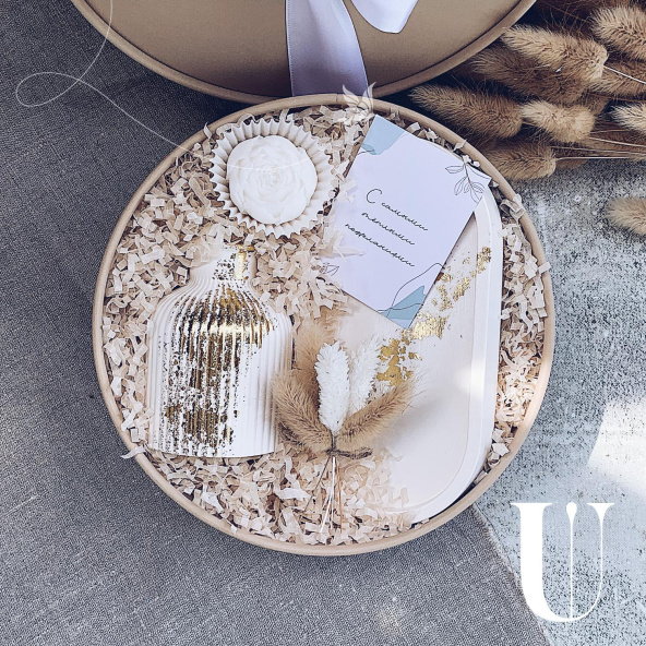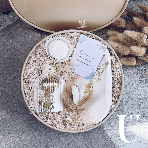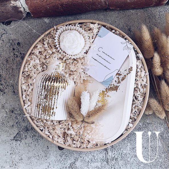 Уникальная ваза с изящным рельефом, которая станет идеальным украшением для цветов или сухоцветов. Ароматная свеча, которая наполнит ваш дом нежным и цветочным ароматом. Красивый букетик из сухоцветов, который добавит изюминку любому интерьеру. Практичный и стильный поднос, который можно использовать для сервировки или хранения мелких предметов. Милая открытка с теплыми словами, которая передаст ваши самые искренние чувства.