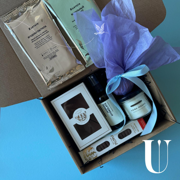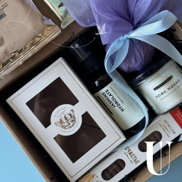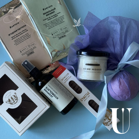 Подарочный набор из микса для ванной, мыла с лавандой, конфетки из бельгийского шоколада, бальзама для губ и соевой свечи
