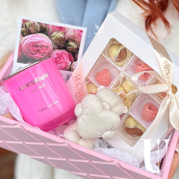 Подарочный набор из кофера, набора конфет, бомбочки для ванны, соевой свечи, пряника ручной работы и клюквы в белом шоколаде