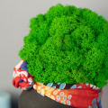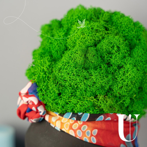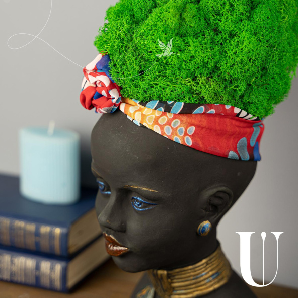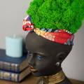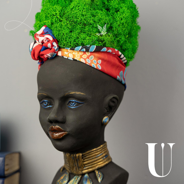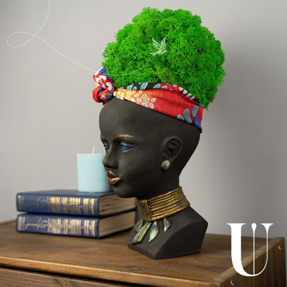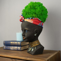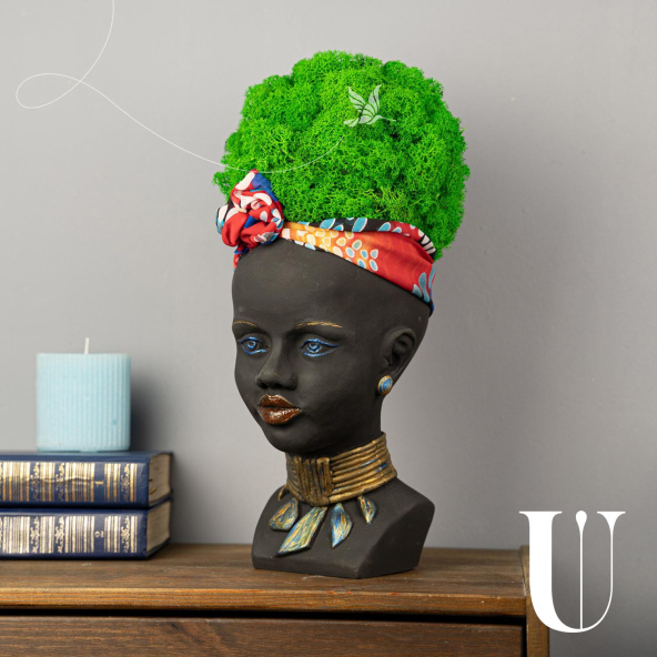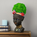 Интерьерная композиция из гипса и декоративного мха. Африканка с прической из зелёного мха
