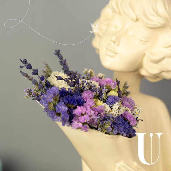Гипсовая интерьерная фигурка с букетом из сухоцветов. В составе: статица, лимониум и лаванда.