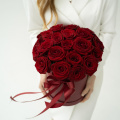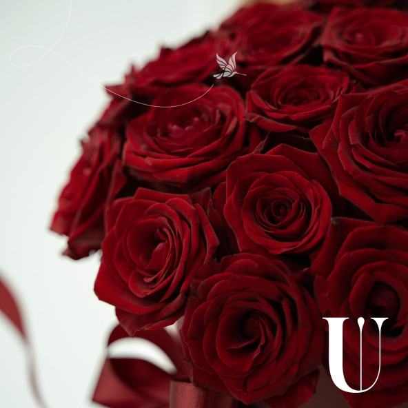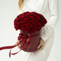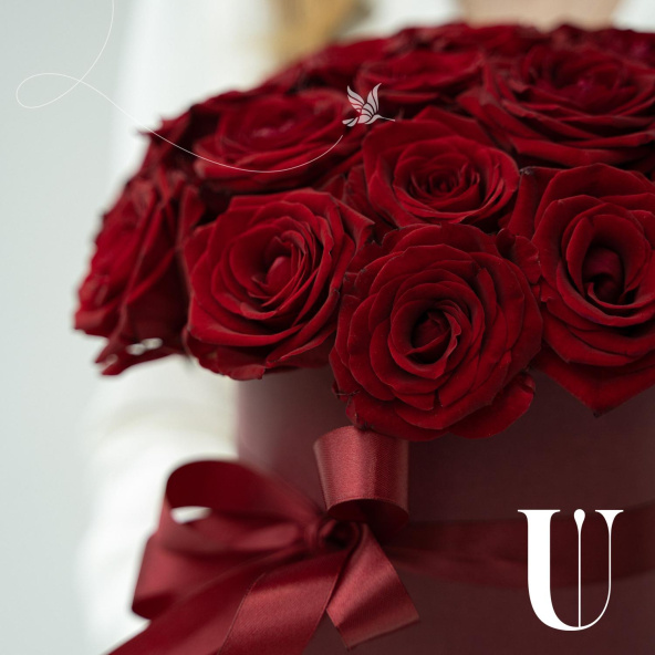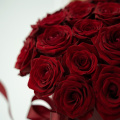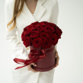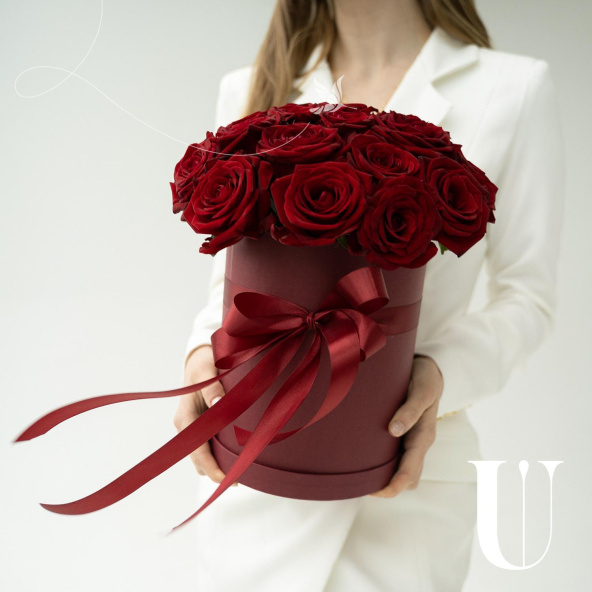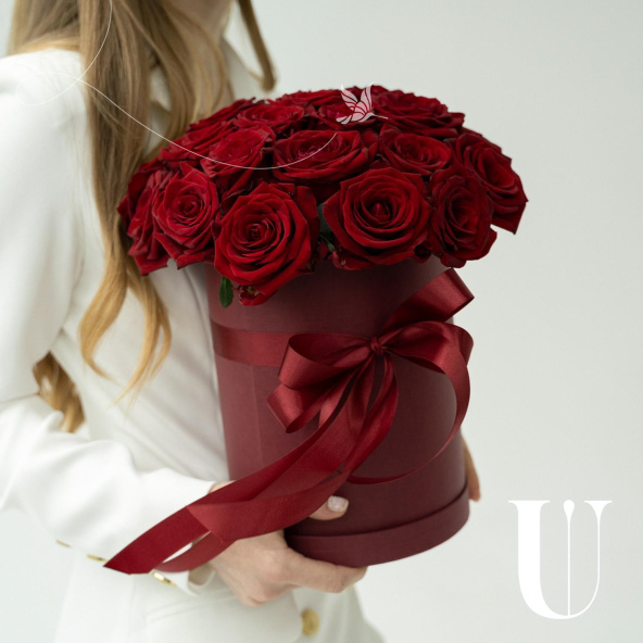25 красных роз в круглой шляпной коробке с атласным бантом